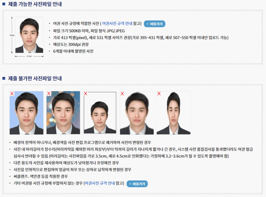 - 여권 사진은 아래 발급 준비서류에 기재된 규격에 맞게 jpg 파일로 준비하여 업로드 합니다.